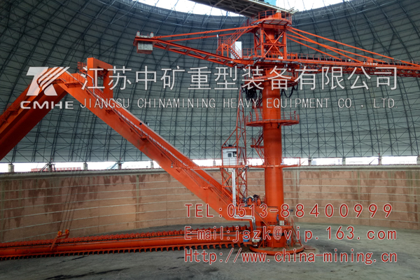圓形料場堆取料機是懸臂堆料機與刮板取料機集于一體設(shè)備,是一種大型、環(huán)保、連續(xù)、 高效的散料裝卸機械,實用于碼頭、鋼鐵廠、水泥廠、大型火力發(fā)電廠和礦山等,可以裝卸鐵礦石(砂)、煤炭、砂子、石灰石、水泥等,圓形堆取料機被半球形網(wǎng)架外殼所籠罩,堆取料作業(yè)時集中于定心旋轉(zhuǎn)的回轉(zhuǎn)范圍內(nèi),不受臺風(fēng)等惡劣天氣的影響,同時產(chǎn)生的揚塵范圍小,又被拘囿在固定的區(qū)域內(nèi),所以,它很好地解決了常規(guī)的敞開式條形煤場堆取料機作業(yè)時所產(chǎn)生的大量揚塵對周邊環(huán)境造成的大范圍污染,既美觀又環(huán)保,綜合效益高,具備儲料量大、占地面積小、場地利用率高、安全可靠性高、環(huán)保效益好等優(yōu)點。取料和堆料作業(yè)時具備兩個層次分明的堆料回轉(zhuǎn)機構(gòu)和取料回轉(zhuǎn)機構(gòu),使堆料機和取料機形成兩套互不干涉、相對獨立的運行系統(tǒng),實現(xiàn)同時進(jìn)行堆料和取料作業(yè)。我司目前有圓形堆取料機軌道直45m-120m各種規(guī)格。