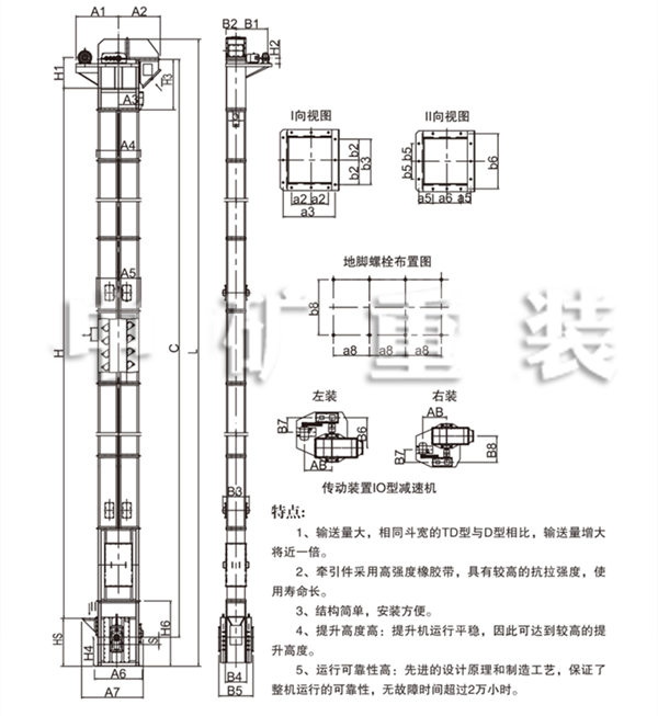 TD型斗式提升機適用于垂直輸送粉狀、粒狀,及小塊狀的磨琢性較小的散狀材料,如糧食、煤。水泥、碎礦石等,提升高度40m,其特點為結構簡單,運行平穩,挖取式裝料,離心式卸料,物料溫度普通膠帶不超過60℃,夾鋼絲膠帶可達80℃,耐熱膠帶可達120℃,與傳統D型斗提升機相比,輸送效率高,料斗型式多,應優先選用。